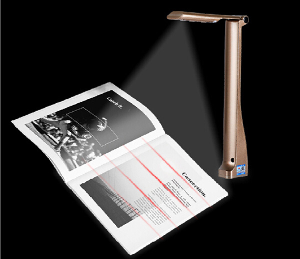 在結構上,K8采用折疊式結構,鏡頭可以折疊收起到直立的支桿上,減小體積方便收納和攜帶。流線型外觀,有兩種顏色可以選擇,金色的是烤漆工藝,高檔耐用;黑色的是皮革漆工藝,手感一流。產品尺寸僅為63*40*338mm,重量僅為0.3kg,相比傳統的大塊頭掃描儀,真是小巧玲瓏!K8的拍攝桿可以270度翻轉,這是別出心裁的專利設計。任意角度停留拍攝,所以大大增加了掃描幅度,不僅可以掃描文檔,還可以拍攝人像和場景。