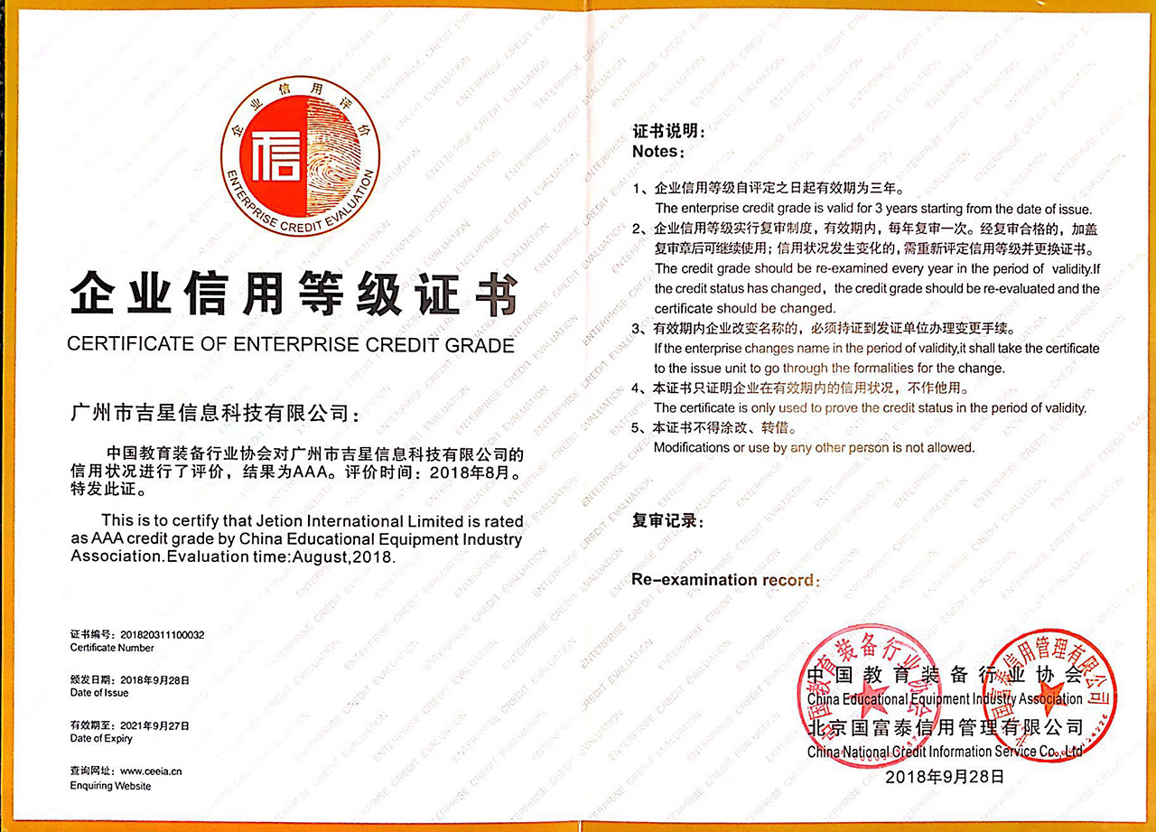 近日,中國教裝備行業(yè)協(xié)會和信用評價工作委員會聯(lián)合發(fā)布了“關(guān)于公布2018年中國教育裝備行業(yè)協(xié)會企業(yè)信用等級評價結(jié)果的通知”(教信評文【2018】4號文件),經(jīng)地方協(xié)會預(yù)審、推薦,最終確定參評企業(yè)僅有405家獲得評級資格,其中,只有46家企業(yè)獲得AAA級企業(yè)信用等級證書,包括有四川長虹教育、北京育靈童等,吉星集團此次獲得AAA高信用評級榮譽稱號,無疑是教育裝備協(xié)會和專業(yè)機構(gòu)對公司經(jīng)營能力和信用水平的最高認可。