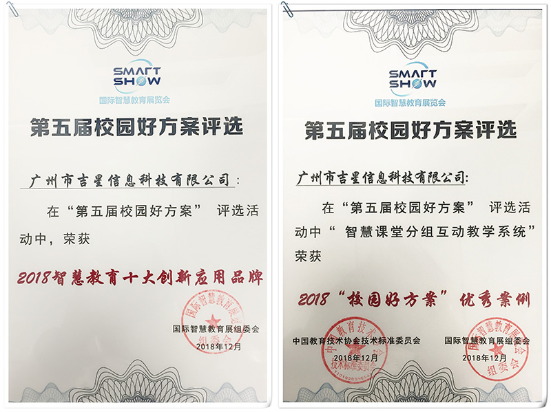 吉星榮獲年度“2018校園好方案”優(yōu)秀案例與“2018智慧教育十大創(chuàng)新應用品牌”