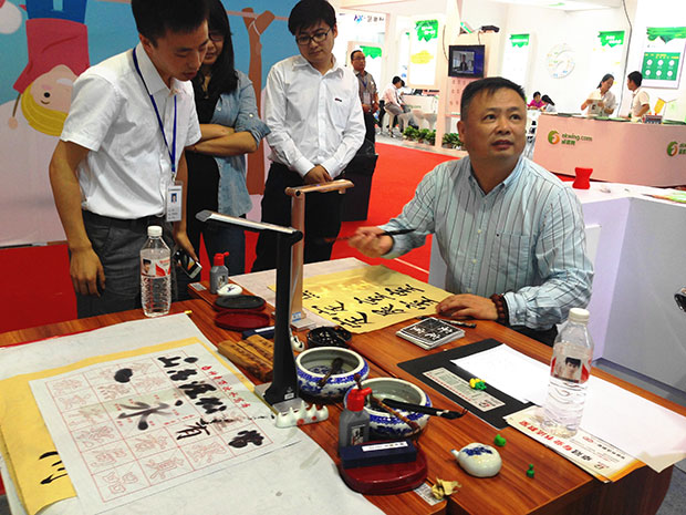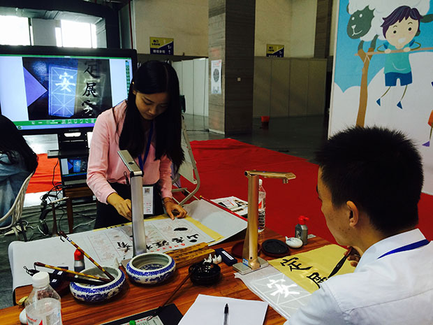 我們模擬搭建的“展示互動(dòng)書法課堂”是吉星展臺的一大亮點(diǎn),課堂上老師在無線展臺下進(jìn)行書法過程展示,畫面通過無線WiFi傳輸?shù)酱笃聊?,大家可以通過清晰地觀察老師的執(zhí)筆方式、筆鋒走向和字體結(jié)構(gòu),進(jìn)行同步臨摹學(xué)習(xí)。經(jīng)過的大朋友、小朋友無不駐足圍觀,躍躍欲試,這么生動(dòng)活躍的課堂,通過吉星無線視頻展臺這一媒介,將來一定會(huì)復(fù)制到全國千萬學(xué)校課堂去,讓更多的師生從中受益!