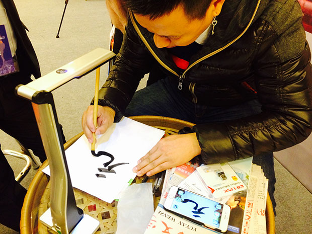 展會(huì)上毛筆書(shū)法培訓(xùn)機(jī)構(gòu)在試用吉星無(wú)線展臺(tái)