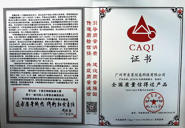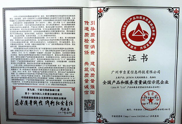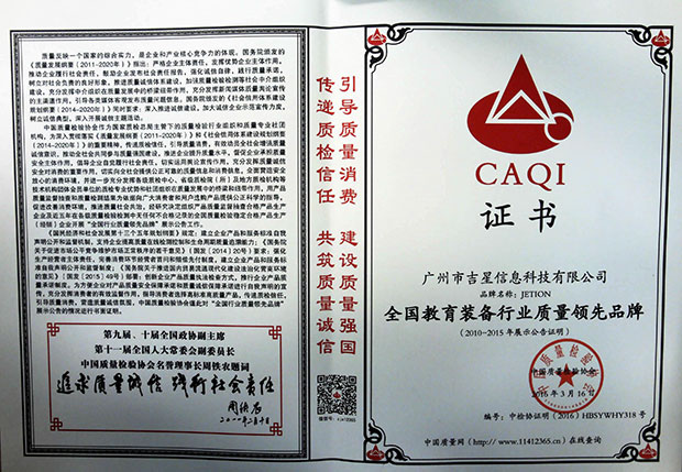 2016年“3.15”國際消費(fèi)者權(quán)益日“產(chǎn)品和服務(wù)質(zhì)量誠信承諾”中,經(jīng)國家質(zhì)檢總局、中國質(zhì)量檢驗(yàn)協(xié)會的全面評選,廣州市吉星信息科技有限公司從上千家企業(yè)中脫穎而出,一舉斬獲“全國教育裝備行業(yè)質(zhì)量領(lǐng)先品牌”、“全國產(chǎn)品和服務(wù)質(zhì)量誠信示范企企業(yè)”和“全國質(zhì)量信得過產(chǎn)品”三大殊榮!《中國質(zhì)量報(bào)》、《中國消費(fèi)者報(bào)》、中國經(jīng)濟(jì)網(wǎng)、中國質(zhì)檢網(wǎng)、中國消費(fèi)網(wǎng)等多家媒體均予以集中展示和公告。