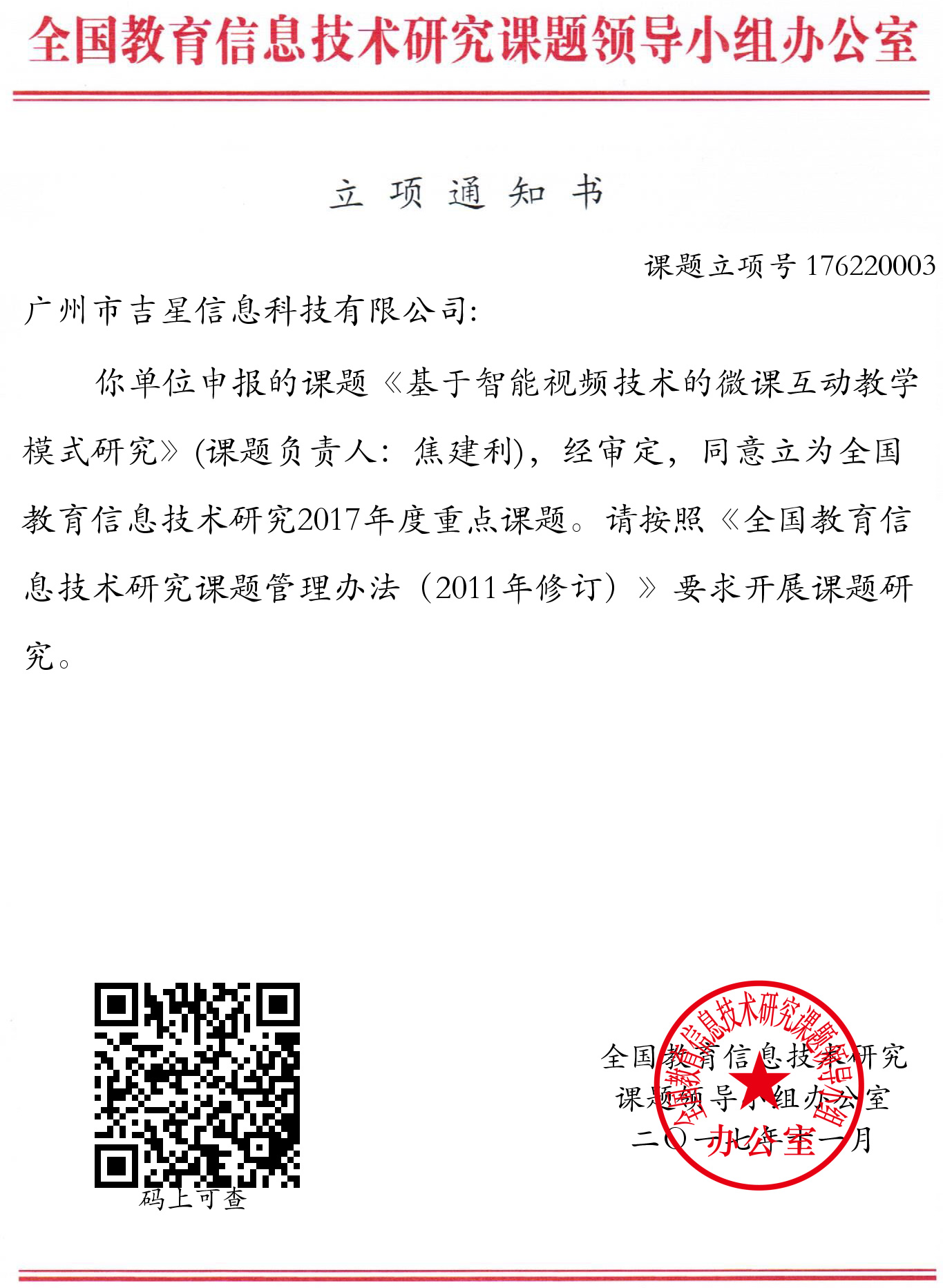 “基于智能視頻技術(shù)的微課互動教學(xué)模式研究”課題是全國教育信息技術(shù)研究課題領(lǐng)導(dǎo)小組辦公室(以下簡稱“課題辦”)批準(zhǔn)立項(xiàng)的全國教育信息技術(shù)研究2017年度重點(diǎn)課題(立項(xiàng)號:17622003),旨在完善基于新型智能視頻技術(shù)的微課互動教學(xué)系統(tǒng)的基礎(chǔ)上,創(chuàng)建基于新型智能視頻技術(shù)的微課互動教學(xué)平臺應(yīng)用的方法與模式,目的在于使教學(xué)系統(tǒng)既具有獲取教學(xué)資源,組織、展示、交流、學(xué)生自主、協(xié)作與探究性學(xué)習(xí)的過程與成果的功能,又具有針對學(xué)生的學(xué)習(xí)情況實(shí)時制作、應(yīng)用微課資源的功能,還具有師生、家長共享、共用微課等教學(xué)資源的功能;并且使微課能夠更好地支持信息技術(shù)與教育教學(xué)活動的融合創(chuàng)新發(fā)展,更加有效地提高教育教學(xué)的效率與質(zhì)量。本課題由廣州市吉星信息科技有限公司承擔(dān),由華南師范大學(xué)焦建利教授擔(dān)任課題組組長。課題邀請了國內(nèi)知名的教育信息技術(shù)專家、學(xué)科教學(xué)專家等組成專家組對課題進(jìn)行指導(dǎo)。